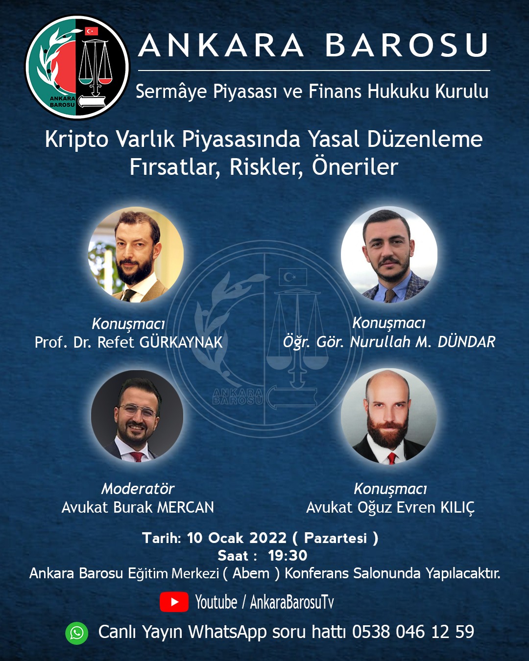 Kripto Varlık Piyasasında Yasal Düzenleme: Fırsatlar, Riskler, Öneriler Ankara Barosu Sermâye Piyasası ve Finans Hukuku Kurulu tarafından 10 Ocak 2022 târihinde düzenlenen panel.